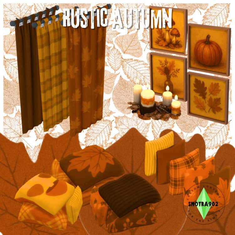 The set includes patterned rugs, plaid curtains, autumn-themed wall art, candles, and two sets of plush pillows. Use these to create a gorgeous living room space. The color palette leans into rich browns, burnt oranges, and deep reds, giving your Sim’s living space a welcoming rustic atmosphere.