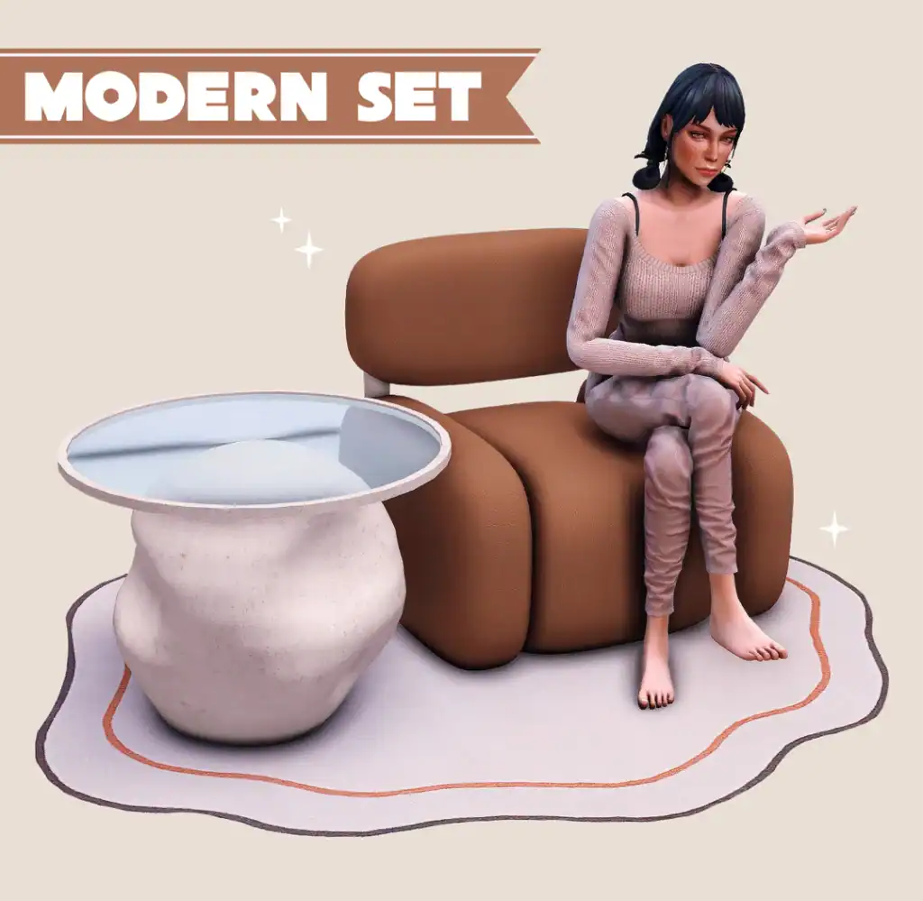 Add a bold touch to your interiors with the Modern Set, a small yet stunning furniture cc collection designed in a contemporary style. The set includes a sculptural rock table with a glass top, a sleek curved chair, and a unique wavy rug, all designed to make your Sim’s space feel artistic and refined.