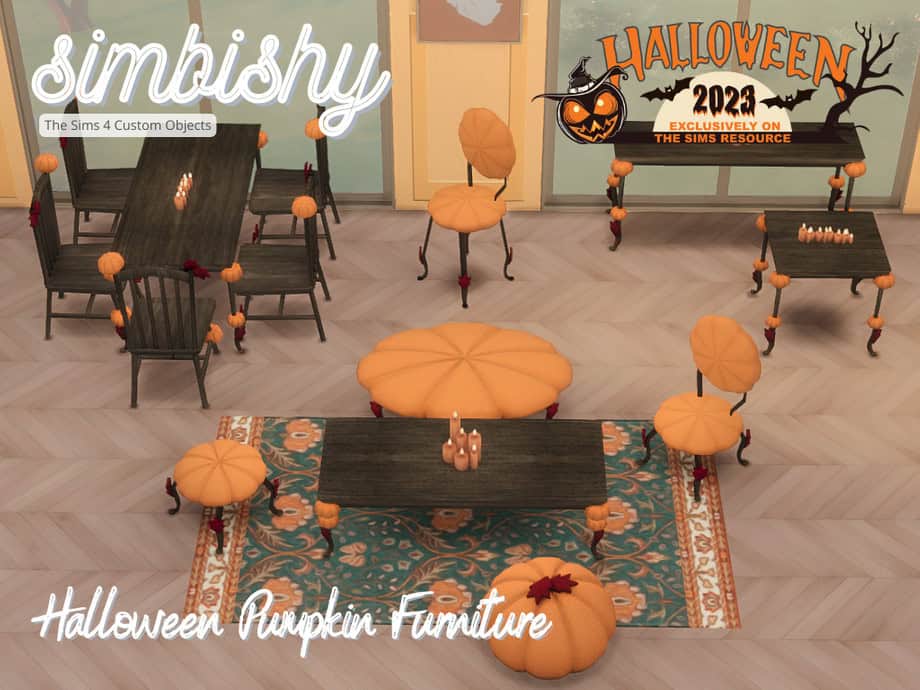 Bring the spooky season straight into your Sim’s homes with the Halloween Pumpkin Furniture Set. This charming collection transforms classic country-style wooden furniture into whimsical pumpkin-shaped masterpieces, perfect for a cozy and festive vibe.