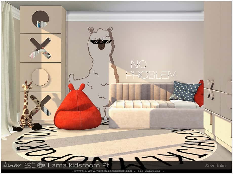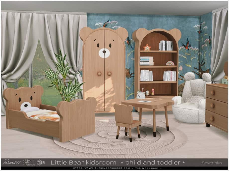 If you’re looking for modern and playful Sims 4 furniture cc for your Sim’s nursery, grab the Dalia Kids Room Set. It’s a cozy minimalist pack designed with a soft, family-friendly feel. This 4-piece collection includes a stylish crib, dresser, living chair, and curtain. Each item is available in four warm color swatches, which blend beautifully into any interior theme.