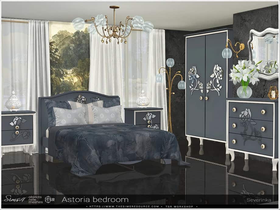 Mix and match the items in this Sims 4 furniture cc pack to create a high-end bedroom or a moody study area.