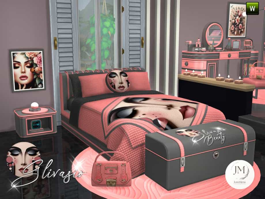 The blanket is my favorite item on the set because of its bold visuals inspired by makeup and art. Use this pack to create a chic, feminine, and unapologetically sophisticated space. The set is perfect for Sims who love luxury interiors with personality and flair.