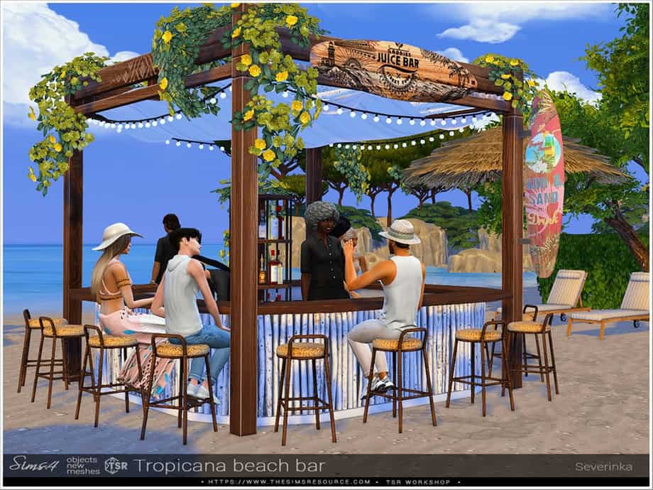 If you want to turn your Sim’s beach lot into a tropical hangout, grab the Tropicana Beach Bar CC.