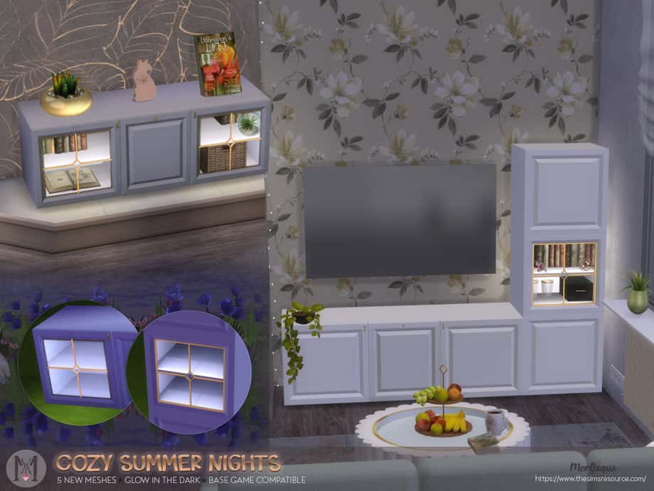 Designed by Merlisque, the Cozy Summer Nights Set is a furniture collection that literally glows. The pastel cabinets, tables, and TV stands emit a gentle light that shifts throughout the day. Note that each piece includes deco slots for clutter, picture frames, or memory trinkets to make your Sim’s homes feel alive.
