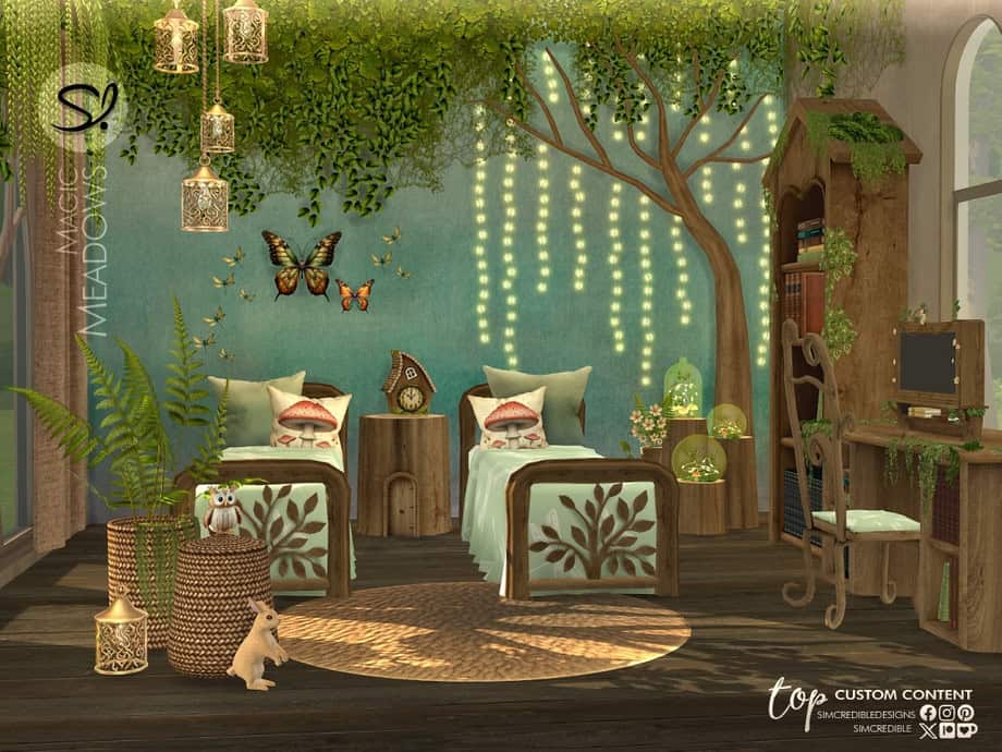 The pack comes with a dreamy canopy bed in three sizes, a hanging chair, a macrame wall decor, and lush plants in woven baskets. There are 16 swatches to mix and match to fit your style. You’ll also find four wallpapers, tall windows, a dresser, and charming night tables. Basically, everything you need for a layered, “lived-in” boho feel.