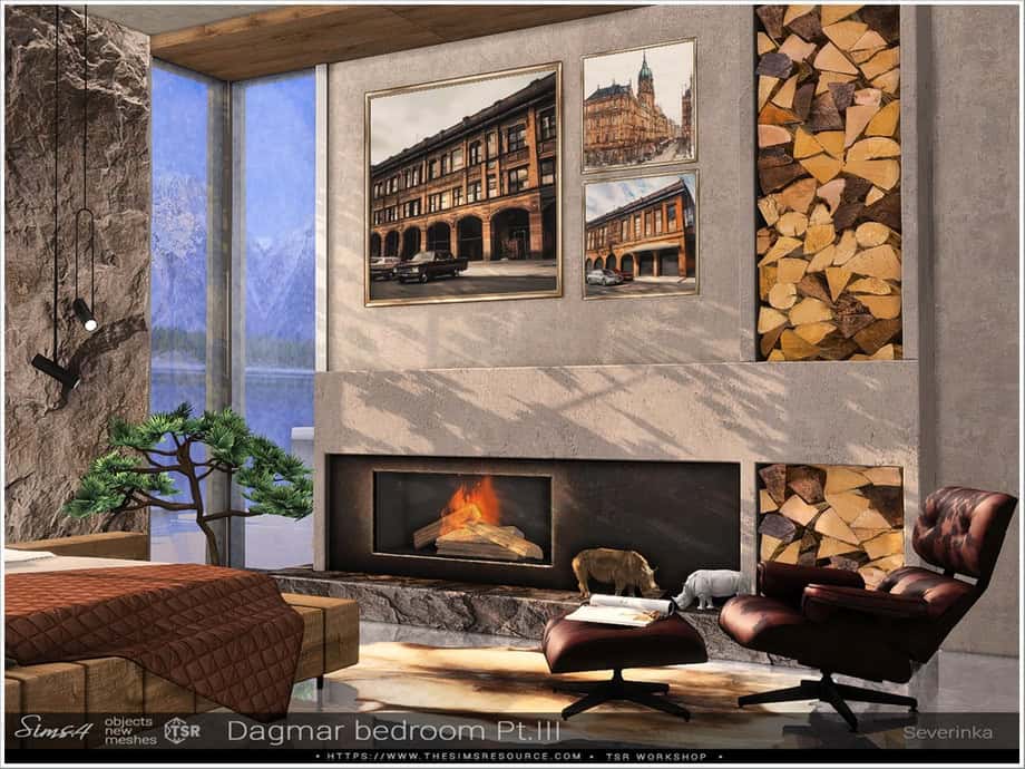 Turn your Sim’s home into a beautiful modern retreat with the Dagmar Bedroom Part III. This furniture and decor collection radiates contemporary sophistication, blending warm natural textures with minimalist design.