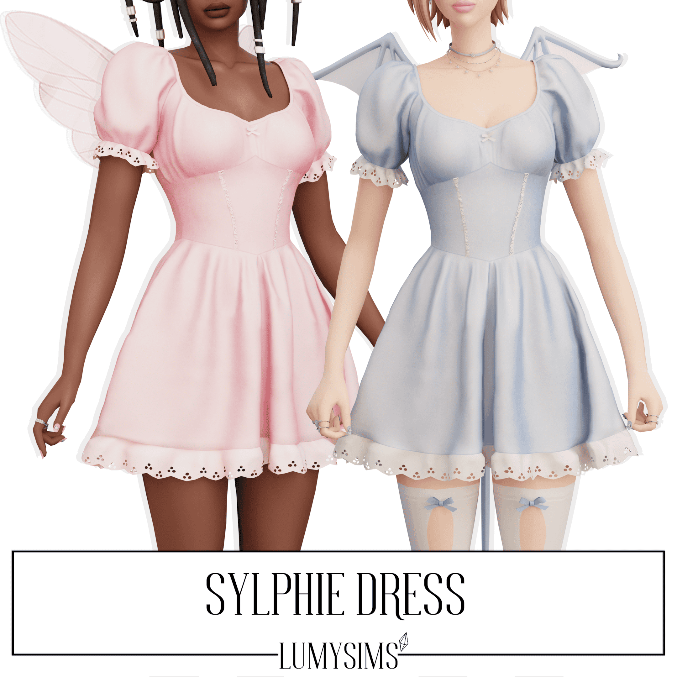 If you’re anything like me and obsess over whimsical, fairycore fashion, the Sylphie Dress by Lumysims is going to steal your heart. This dreamy piece comes in soft pastel shades with puffed sleeves, a sweetheart neckline, and delicate eyelet trim along the hem. It has just the right amount of innocence and fantasy flair, especially when paired with wings or dainty stockings.
