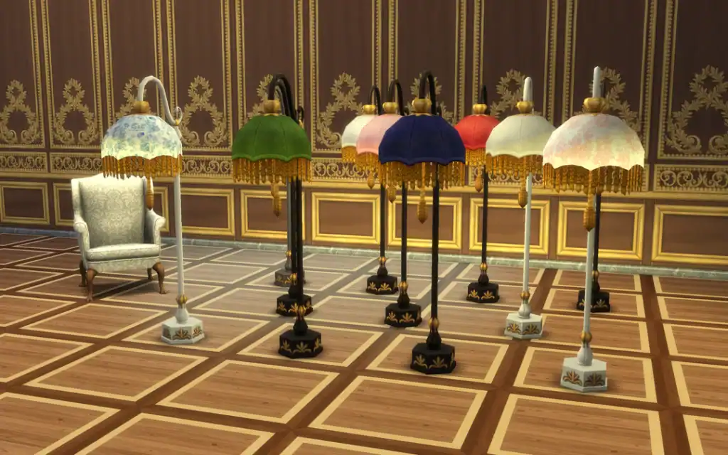 Luxury rooms deserve dramatic lighting, like these Victorian lamps. It’s designed with a curved brass stem, an ornate base, and a tasseled fabric shade, which casts a warm, vintage glow. The creator added 11 new swatches, including deep velvet colors, soft florals, and toile patterns in blue and pink.