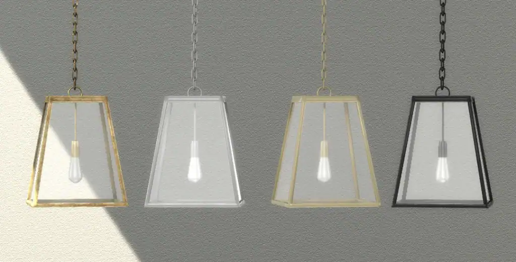 If you’re looking for modern ceiling lights with clean metal frames, grab these Caged Pendant Lamps. This Sims 4 cc set includes two geometric styles: the Kenwood Lamp and the Four-Sided Lantern. Each lamp is available in five metal swatches of gold, silver, black, and white. You can also choose between versions with glass and without, depending on the vibe you’re going for.