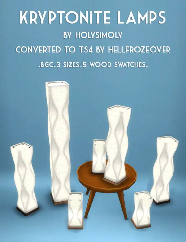 For those who want sculptural lighting, these Kryptonite lamps are a great choice. They’re my go-to Sims 4 lamps cc because of their eye-catching and stunning design. The faceted, twisted shape glows softly from within, almost like a carved crystal. You’ll find the lamps in three sizes: small, medium, and tall, with multiple wood-tone bases.