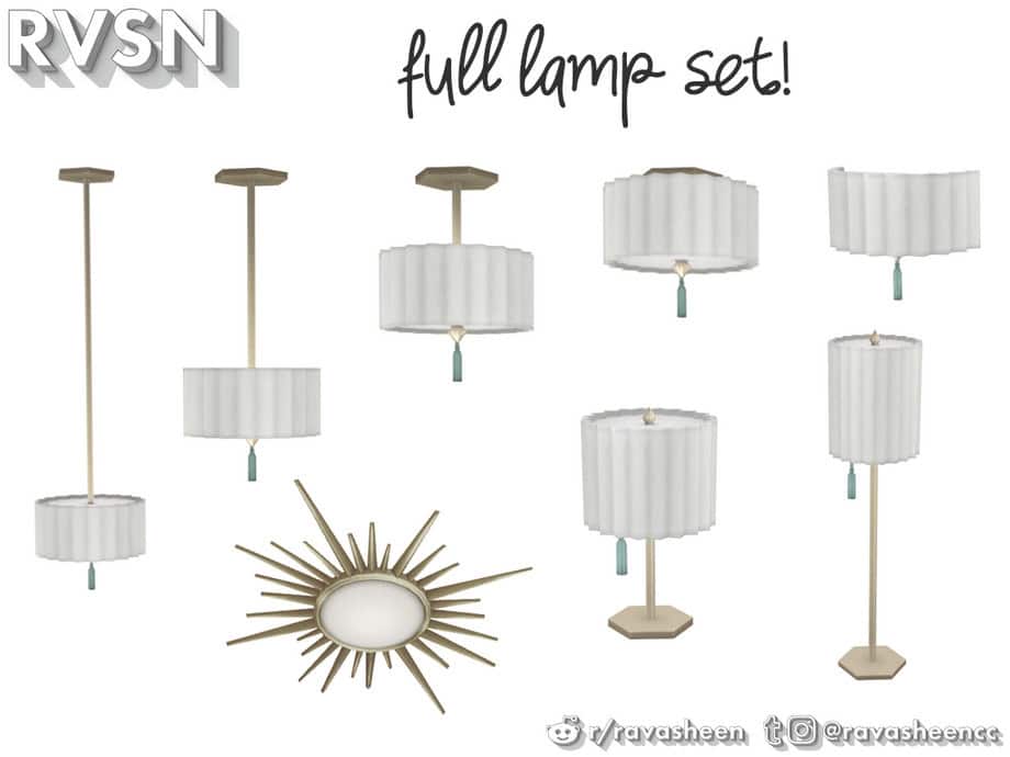The set includes ceiling, floor, table, and wall lamps, with options for one, two, or four glass shades depending on how much brightness you want in the space. All pieces come in four color variants. These Sims 4 lamps cc work well in bedrooms, entryways, and living rooms.