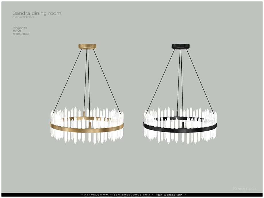If you want your Sim’s modern dining room to always shine bright, use this ceiling lamp. Each pendant features a circular glass orb framed in brushed metal, hanging from a sleek rod. You can choose between gold or black metal finishes, which are the perfect shades for glam and minimalist interiors.