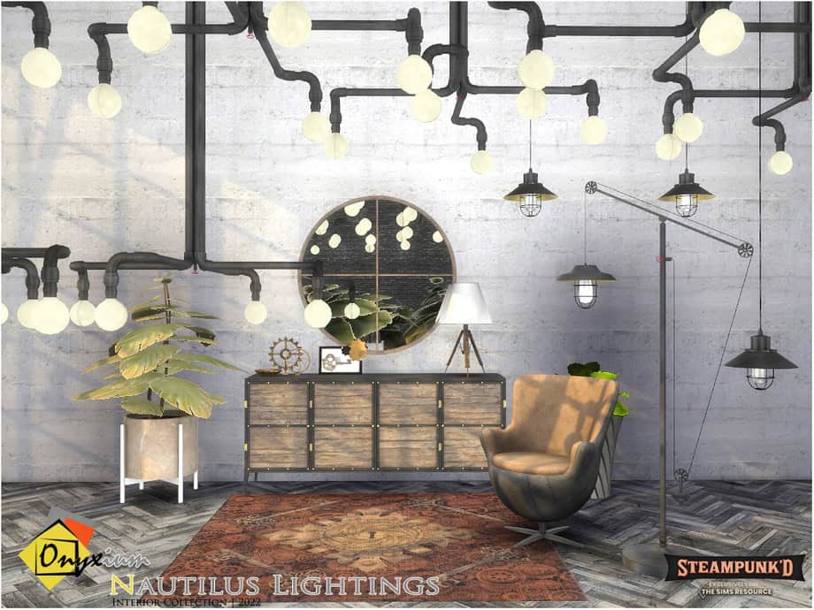 Last on this list is the Nautilus Lightings set, a gorgeous steampunk-themed collection that mixes metal pipes, exposed bulbs, and vintage industrial shapes. The set includes ceiling lamps in multiple lengths, a table lamp, a floor lamp, and a matching wall light. All these Sims 4 lamps cc give your Sim’s loft, workspace, or underground hideout the perfect gritty aesthetic.