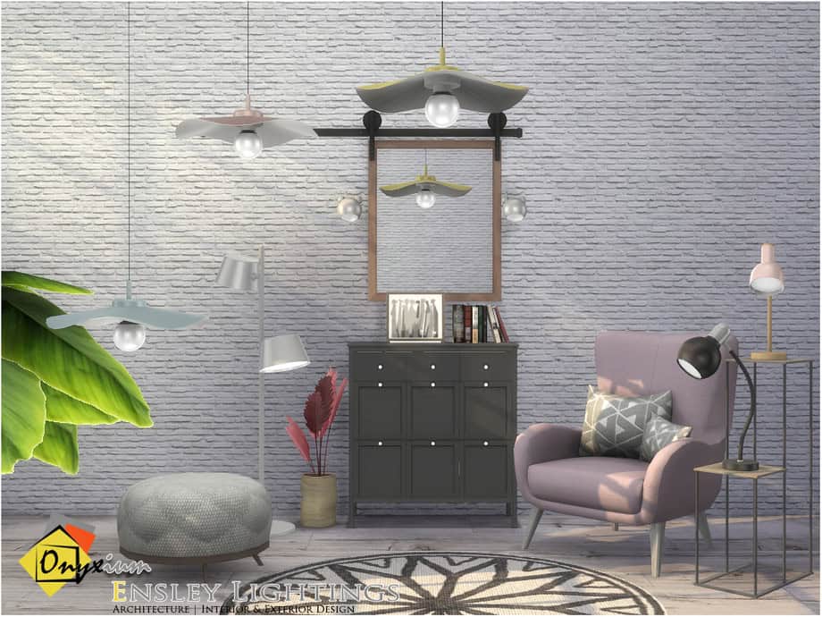Ensley Lightings is a collection of various Sims 4 lamps cc in sleek, elegant designs. These include table, floor, wall, and ceiling lamps, all with soft metallic shades and gently curved stems.