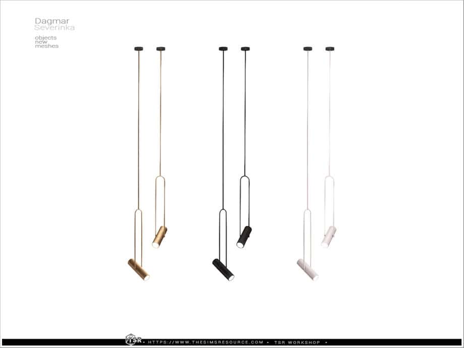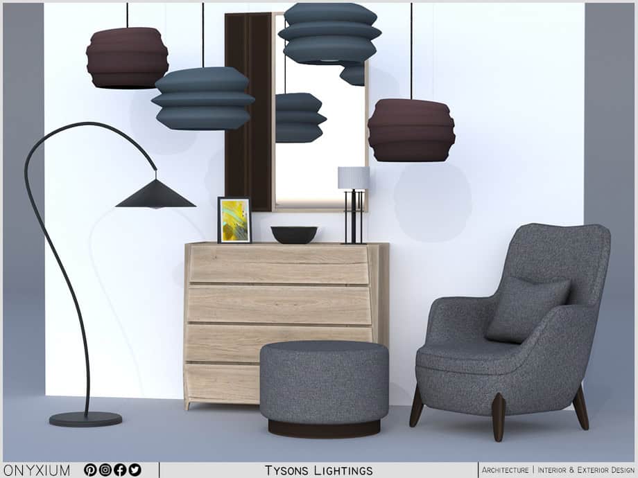 The Tysons Lighting collection by Onyxium contains various Sims 4 lamps cc for every room in your Sim’s home. The standout pieces are the wavy and curvy ceiling lamps, available in multiple heights so you can hang them high or low over dining tables, kitchens, hallways, and bedrooms.