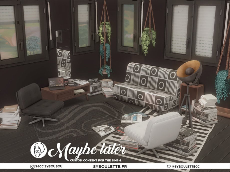 Because it’s part of the Maybe Later set, you can pair the lamp with furniture, stacked books, tangled cables, and small décor pieces that tell a story. I added this to my Sim’s office area to give it a serious, business vibe. But you can add it to a corner in your Sim’s living room to radiate a warm light.