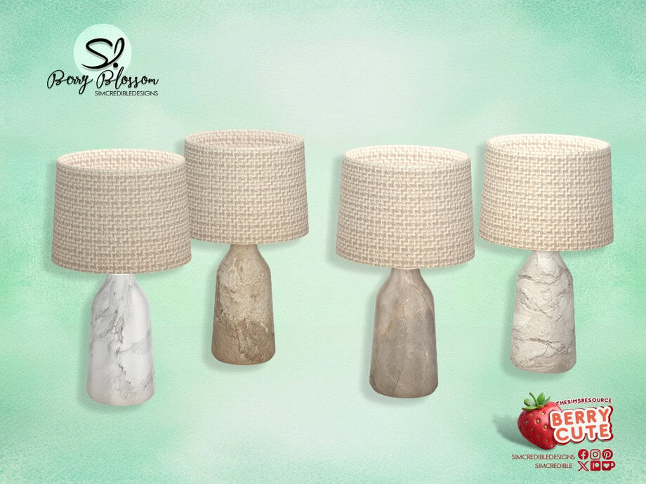 SIMcredible! is one of the best creators when it comes to designing beautiful Sims 4 lamps cc, and this Berry Blossom table lamp is no exception. The design mixes smooth marble and stone bases with woven fabric shades, giving bedrooms and dining rooms a warm, rustic finish.