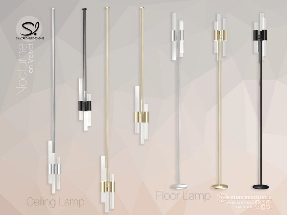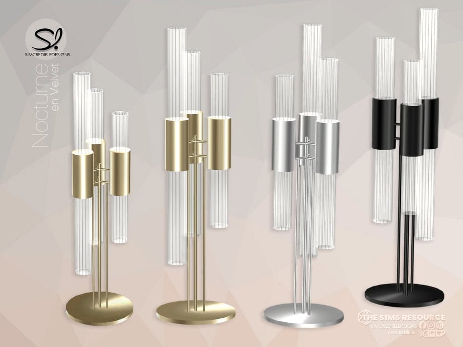 The Nocturne En Velvet floor lamp uses slender glass tubes and metallic accents to create a tall, sculptural piece that instantly elevates your Sim’s space.