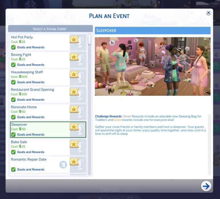Another essential event to add to your Sim’s evening routine is this Sleepover Event. It’s a fully structured nighttime social event where your Sims can invite friends or family for a proper sleepover. The event is filled with various activities that naturally lead into bedtime, such as brushing teeth, watching a movie, and grabbing a drink.