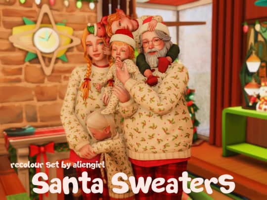 The Santa Sweaters set is filled with cozy holiday charm, bringing warm, festive knit patterns to Sims of every age, including pets.