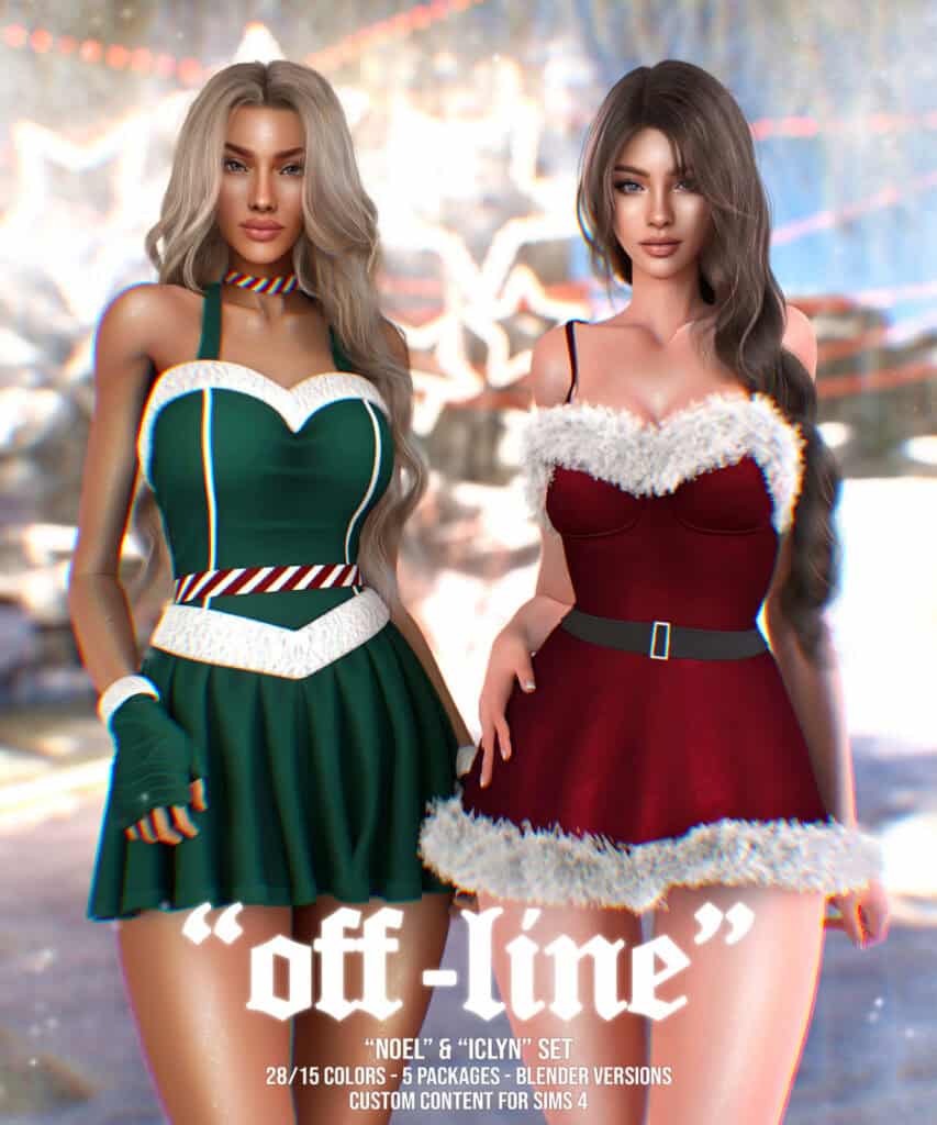 The Noel & Icylin Set introduces two festive mini-dress designs, which are a perfect addition to your Sims 4 santa cc folder. The Noel dress features a candy-cane palette with a fitted bodice and flared skirt, while the Icylin dress offers a softer, fur-trimmed Santa-inspired style for a more classic holiday look.
