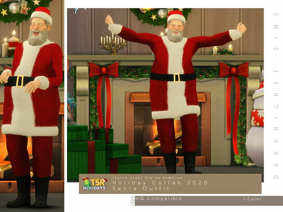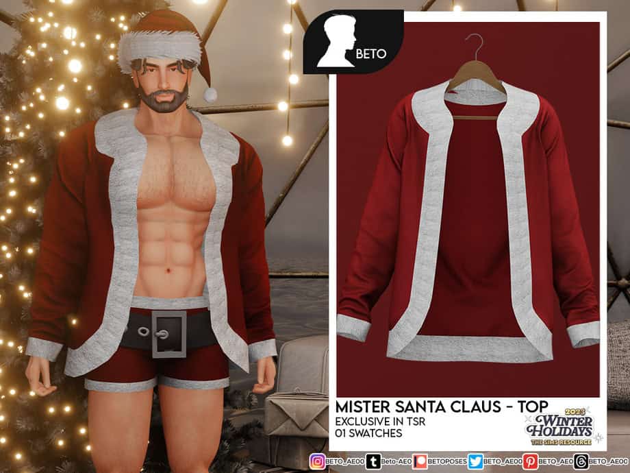 This Santa Claus Remake Set V1 gives your male Sims a bold Santa makeover, complete with festive energy. The outfit comes with:
