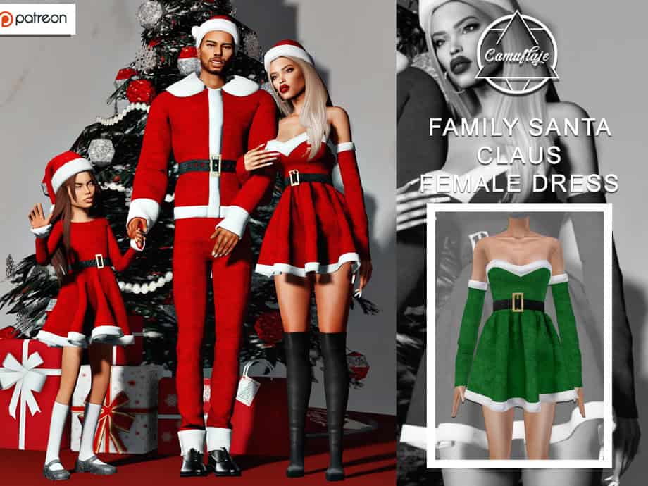 If you’re looking for a classic Santa look to add to your Sims 4 santa cc folder, check out this dress. It’s designed by Camuflaje, and it’s a long-sleeve dress with soft white fur trims and a neatly belted waist that shapes beautifully in CAS.