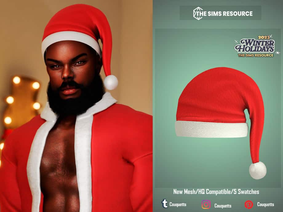 Complete your Sim’s Santa Claus outfit with this hat. It’s designed for both male and female Sims and comes in 5 swatches. The base-game compatible hat is for adults and comes with a custom thumbnail for easy identification in CAS.