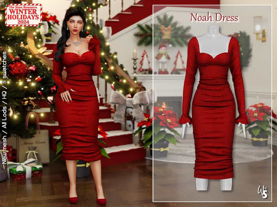 Get the perfect festive evening look with the Noah Dress, a sleek long-sleeved bodycon design that shapes beautifully around your Sim’s figure. The dress has a sweetheart neckline and long sleeves. I recommend using the holiday dress for Winterfest parties, Christmas photos, or any glamorous December event.