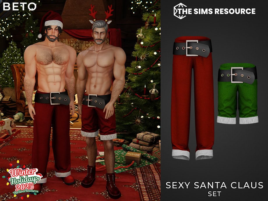 The Sexy Santa Claus set is one of the latest Sims 4 santa cc packs you can add to your festive gameplay. It contains pants and shorts designed in the classic Santa Claus look and feel.