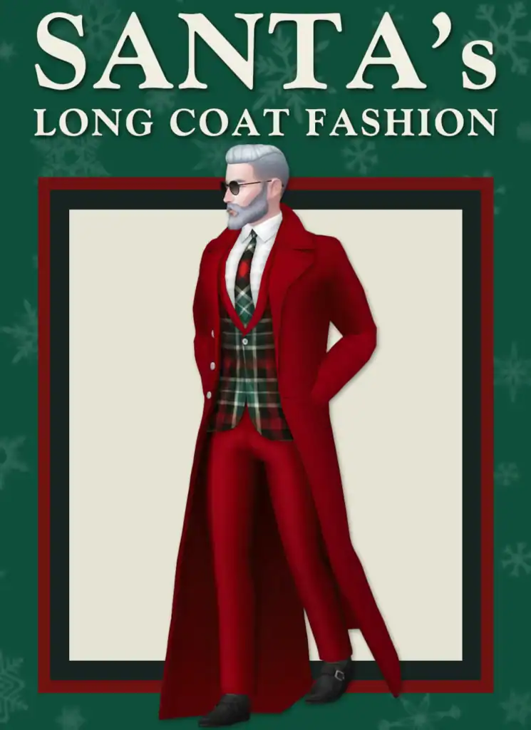 The Santa’s Long Coat Fashion outfit comprises a sweeping red overcoat, tailored pants, and a festive plaid vest layered underneath. The long coat is quite dramatic, making it perfect for Winterfest storytelling, screenshots, and fashionable holiday-themed Sims.