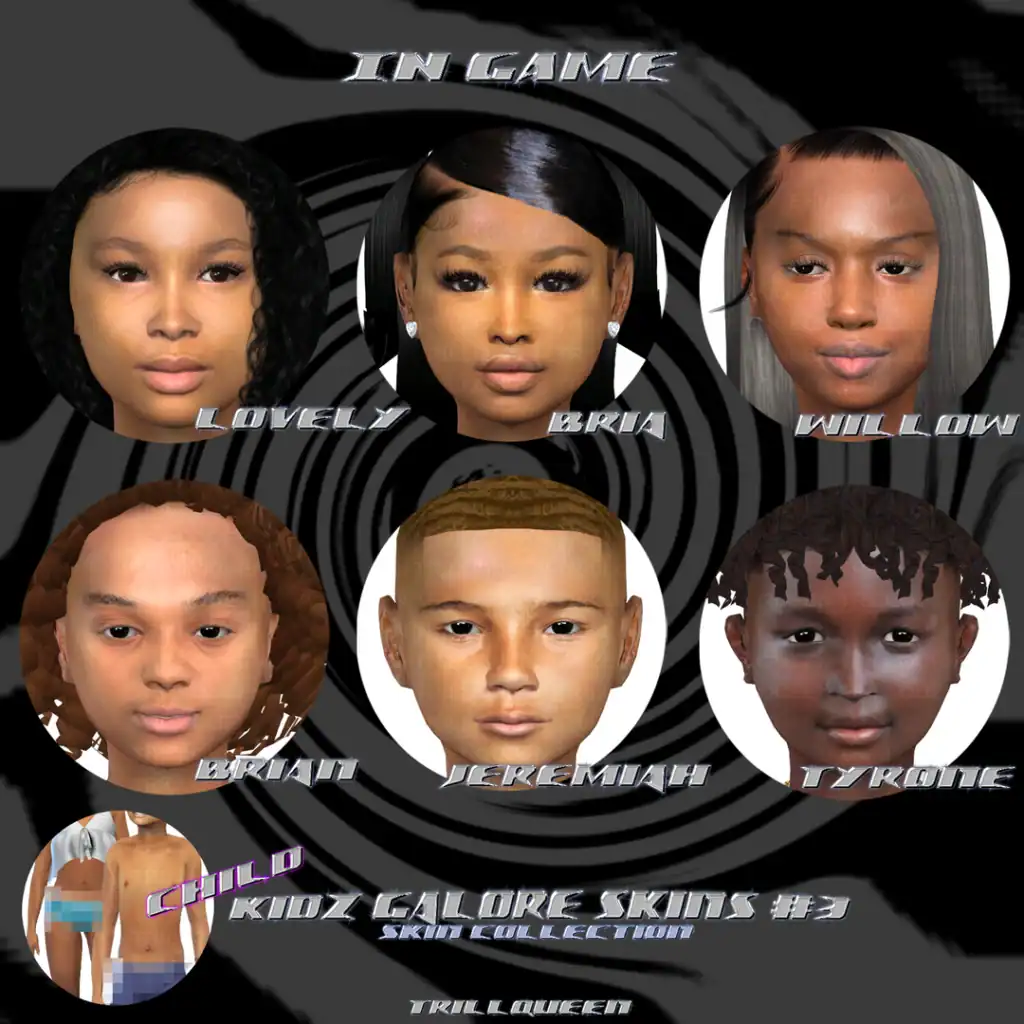 Not many creators design skin presets or overlays for kids, but I was able to find this one by trillqueen. It’s a full-body skin pack with six unique child skins, each available in browed and browless versions. You can use the Sims 4 skin overlay on both male and female kids.
