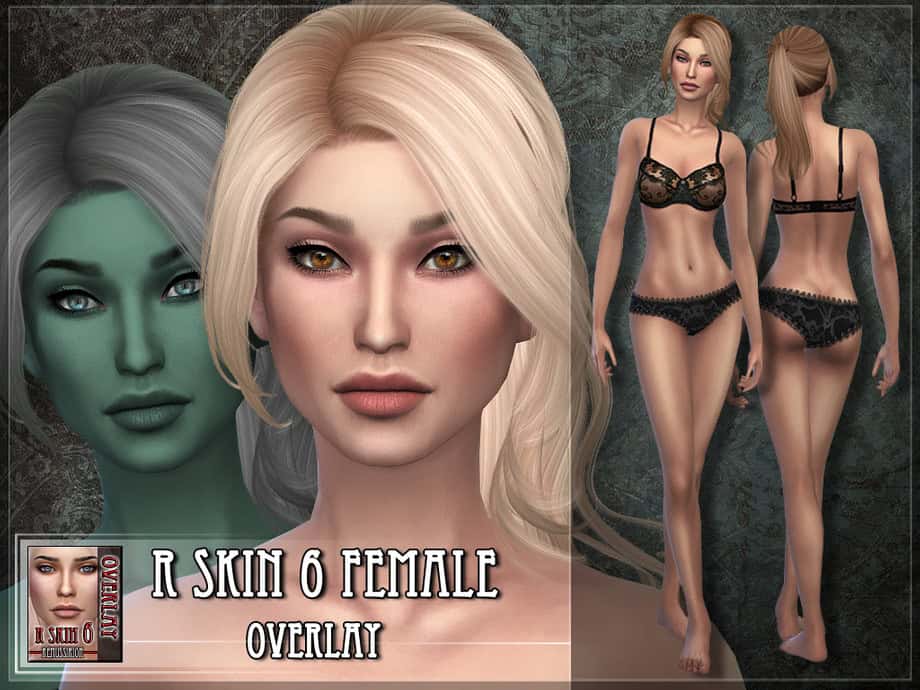 Smooth and balanced are the perfect words to describe the R Skin 6 overlay, as it brings a refined touch to your female Sim’s complexion. This overlay offers three swatches that vary in contrast and brightness, allowing you to fine-tune how soft or striking you want the effect to appear. The skin is also designed to work with all skin tones.