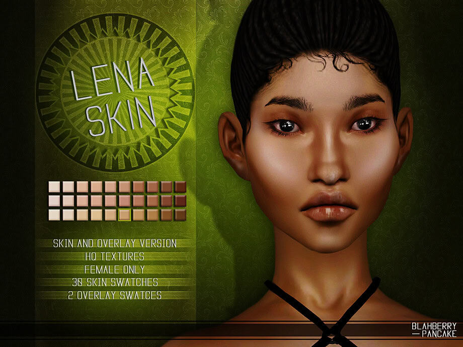 The rich and warm-toned Lena Skin and Overlay is a beautiful natural preset for your female Sims. This set includes 20 skin swatches and 2 overlay versions, each crafted with HQ textures for smooth, realistic detail.