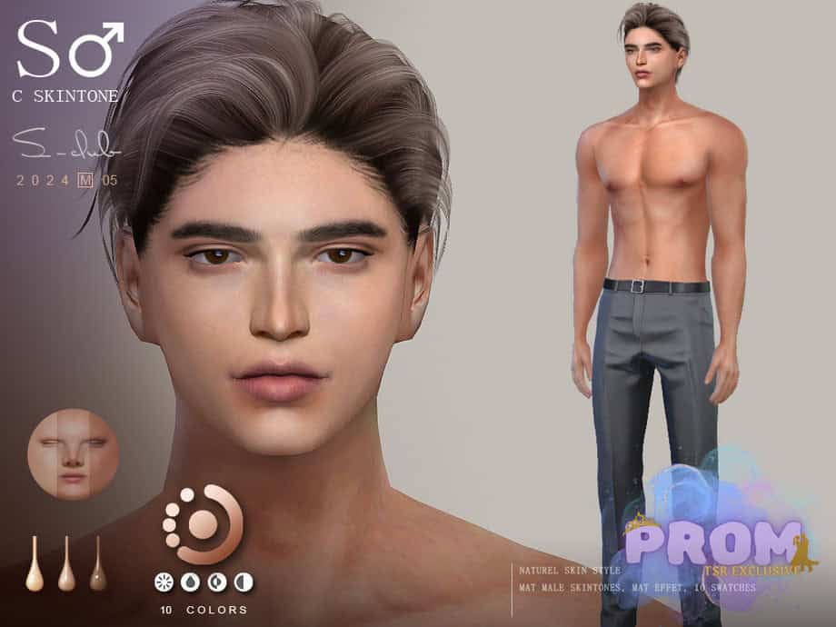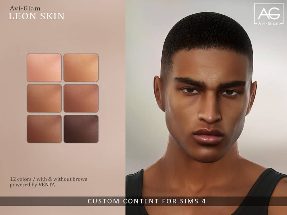 Rich undertones and defined structure make the Leon Skin a standout choice for masculine Sims. It comes with 12 swatches available in both browed and browless versions. This offers players smooth transitions between medium and deep complexions.