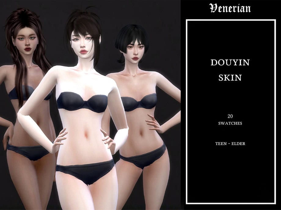 If you’re looking for a flawless, porcelain-like complexion inspired by popular Douyin beauty trends, this skin overlay is a must-have. It features 20 smooth swatches with a luminous finish to give your Sims a delicate, airbrushed glow. It also comes with subtle shading around the cheeks and nose to enhance facial definition without overpowering natural features.