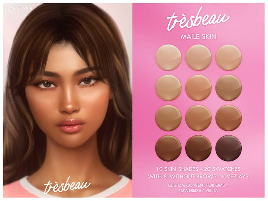 The overlay gives your Sims a balanced glow that works beautifully across different lighting settings without harsh contrast. Note that this skin is part of Très Beau’s signature collection.