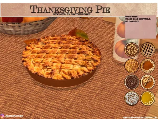 For those who want a simple dish to add to their Sims 4 Thanksgiving cc collection, this pie is an exceptional choice. It’s visually stunning and will look good on your dinner spread. It’s a new mesh that comes in eight swatches, including classic lattice crusts, nut toppings, and seasonal fillings.