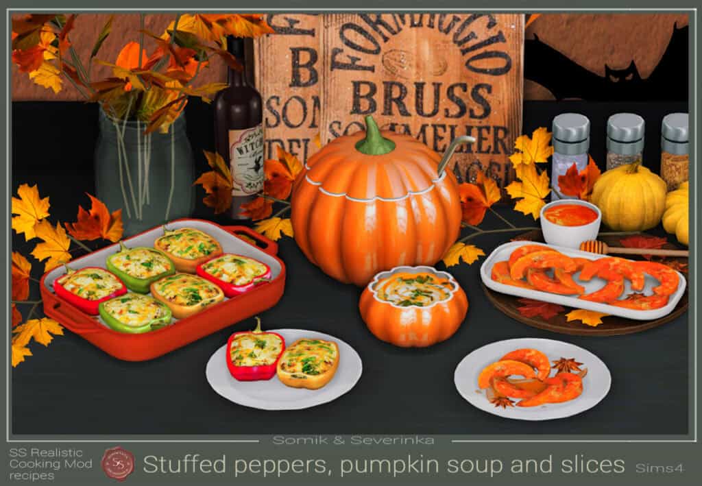 This Sims 4 Thanksgiving cc set contains three warm decorative dishes perfect for Thanksgiving kitchens and autumn tablescapes. The custom foods include a tray of baked peppers, a pumpkin-shaped soup tureen with a matching bowl, and sliced roasted pumpkin slices.
