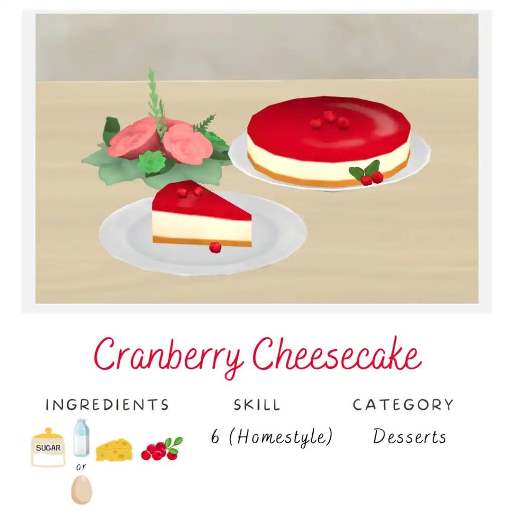 The main ingredients for this dessert are Sugar, Milk or Eggs, Cheese, and Cranberry. Be sure to download TianaSims Cookbook for the recipe to show up in your game.