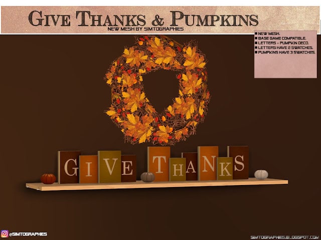 Transform your home into a Thanksgiving space with this Sims 4 decor set. You’ll find two items: