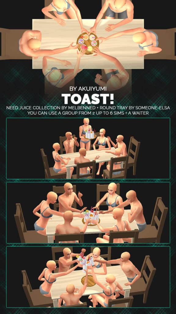 If you want to take family pictures this Thanksgiving, I highly recommend getting this group pose pack. It’s a coordinated table scene where Sims raise their glasses for a shared celebratory moment. You’ll find three group poses for up to six Sims plus a waiter, with an all-in-one version for easier placement.