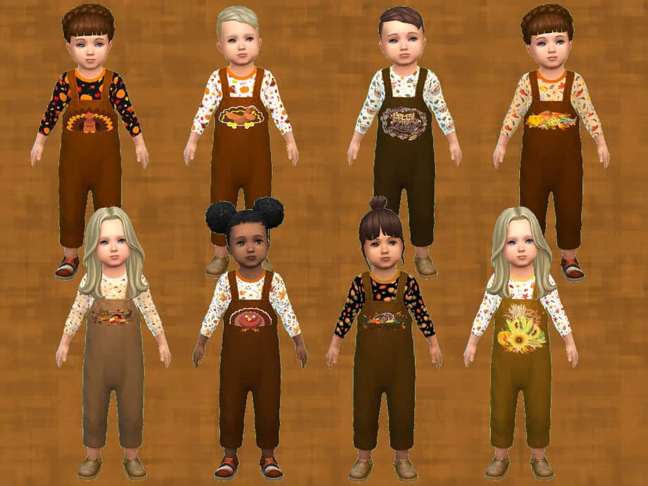 Kids make any holiday fun, and what better way to include them than dressing them up in holiday-themed outfits? The Toddler Thanksgiving Tracksuit is a cute tracksuit for boys and girls in six different designs. It’s a full-body outfit with fun and colorful prints appropriate for children. Note that to use this Sims 4 Thanksgiving cc, you need the Parenthood EP.
