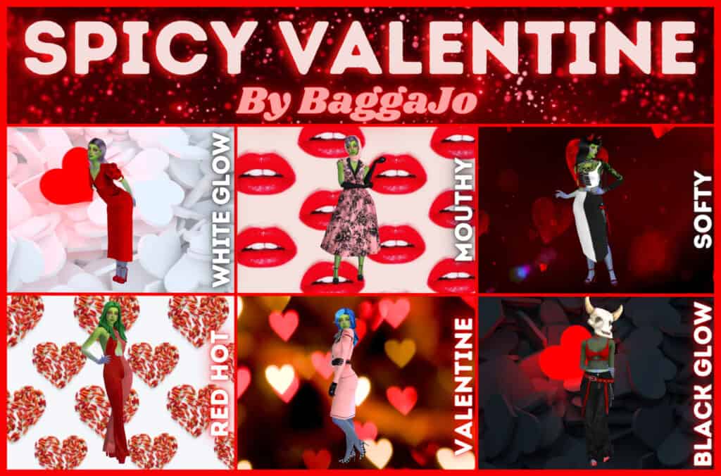 The Spicy Valentine CAS Backgrounds pack is a bold Love Day-inspired collection designed for Simmers who want something more dramatic and playful. This set includes multiple themed background options, ranging from heart-filled designs and lipstick kiss patterns to darker, glowing styles with a more intense romantic mood.
