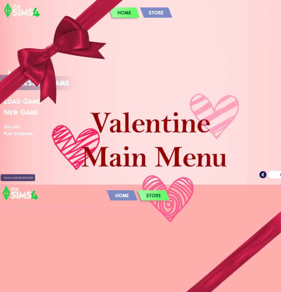The Valentine’s Main Menu override is a soft romantic replacement that gives your Sims 4 start screen a full Love Day makeover. It comes with a warm pink ombré background, heart accents, and a cute Valentine’s gift-ribbon design.