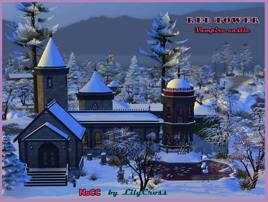 I added the Red Tower to this Sims 4 vampire cc list because of its detailed architecture and cozy interiors. It’s the perfect little castle for smaller vampire households. The two-story lot feels secluded and mysterious without being overly dramatic.