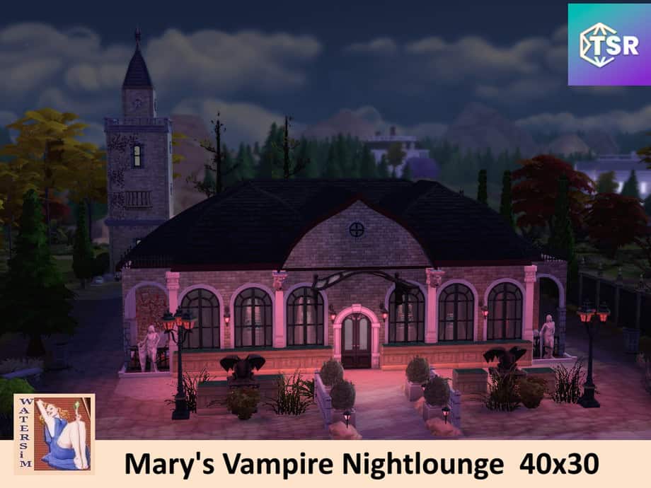Mary’s Vampire Nightlounge is a cozy, gothic hideout made for supernatural nightlife and vampire Sims. The main floor holds tables, cushioned seating, and eerie decor, while the cellar offers a secret indoor pool for late-night swims away from mortal eyes. This Sims 4 vampire cc comes with a graveyard, which gives the entire lot a haunting atmosphere without being overly dramatic.