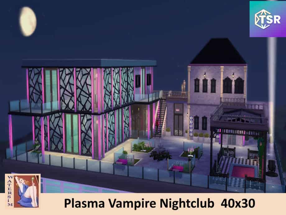 The Plasma Vampire Nightclub is a neon fortress, glowing with electric pinks and purples and eerie stained-glass windows. This Sims 4 vampire cc turns every evening into a supernatural rave. It boasts two stories with a bar, dance floor, lounge areas, and a dramatic view of the moonlit skyline.