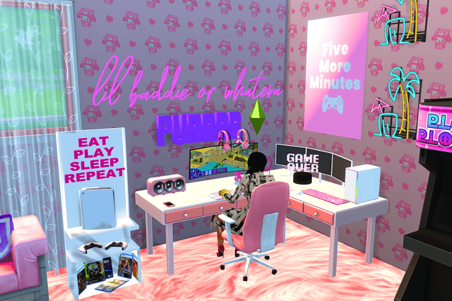 I’ve been wanting to create a dedicated gaming nook for my Sim, and after months of putting it off, SlayStation 5 was finally born. This space blends soft kawaii touches with just the right amount of urban edge. Picture neon lights, chunky headphones, glitchy posters, and a setup that proudly says, “I may be pink, but I don’t play.”