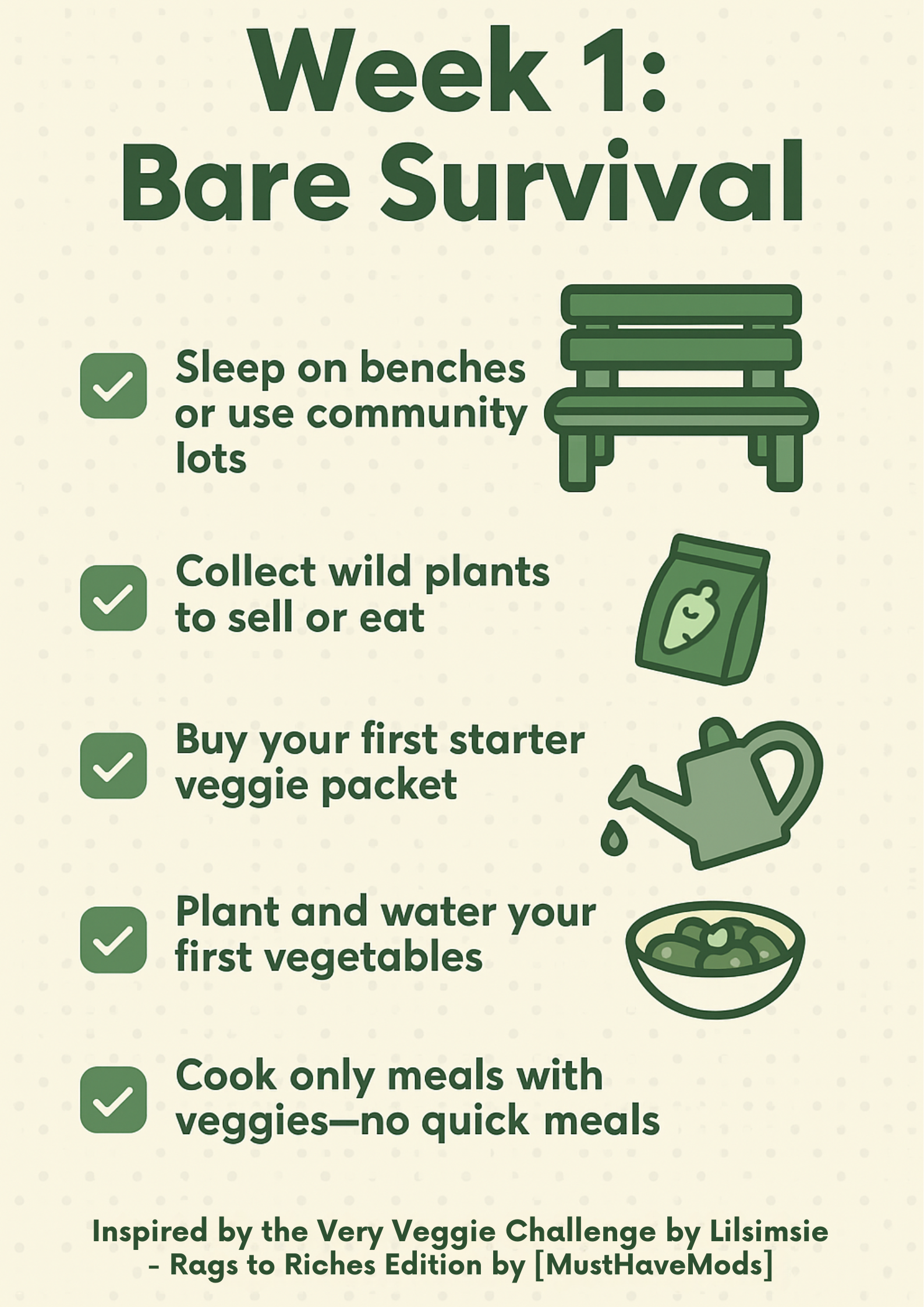 This Very Veggie Challenge version, however, has a unique twist. Inspired by the original rules but ramped up in difficulty, this edition makes your Sim start with absolutely nothing. No home, no money, no safety net. Just a small patch of land and the will to survive off vegetables.